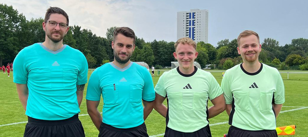 Am Samstag, dem 7. Februar 2026 leiten Adrian Miczuga (2. v.l.) und Dennis Krake (1. v.l.) ab 11:00 Uhr die Partien des 12. NFV Futsal-Cups der C-Juniorinnen. Teilnehmende Vereine in der Halle IGS Wilhelm-Bracke sind der Lehndorfer TSV, SV Meppen, Hannover 96 und ATSV Scharmbeckstotel in Gruppe A sowie SVG Aurich, TSV Barmke, TSV Luthe und MSG Erbstorf/Brietlingen in Gruppe B.