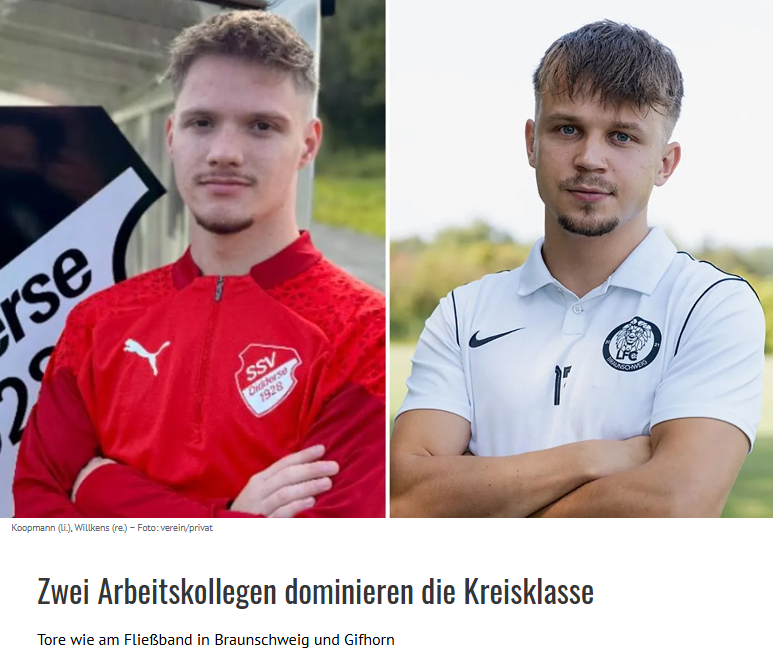 Wenn auf dem Platz die Netze zappeln, haben sie oft ihre Füße im Spiel: Sebastian Willkens vom LFC Braunschweig und Colin Koopmann vom SSV Didderse sind nicht nur zwei der gefährlichsten Torjäger der 1. Kreisklasse – sie sind auch Kollegen im selben Unternehmen.